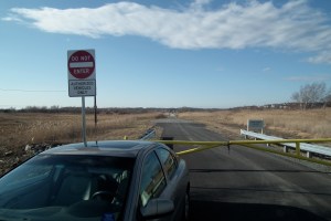 This road is in the middle of a marsh behind a gate with big “DO NOT ENTER, Authorized Vehicles Only” signs on either side. It starts out paved but turns to dirt before disappearing over a small rise. We drive through this marsh, Rumney Marsh as it is called, pretty much every single day for it stretches from Lynn to Revere and is, mostly, in the town of Saugus. Running right through the middle of it is a state highway – route 107 – a four-lane thoroughfare that Amy and I affectionately refer to as “the long straight road” or, simply, “the long straight.”