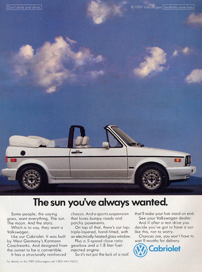 For much of those same teen years that I was cutting out pictures of Porsches, I also had a thing for the VW Rabbit convertible, later redubbed the VW Cabriolet. When it actually came time to buy my first car, I thought I would go with one of them.