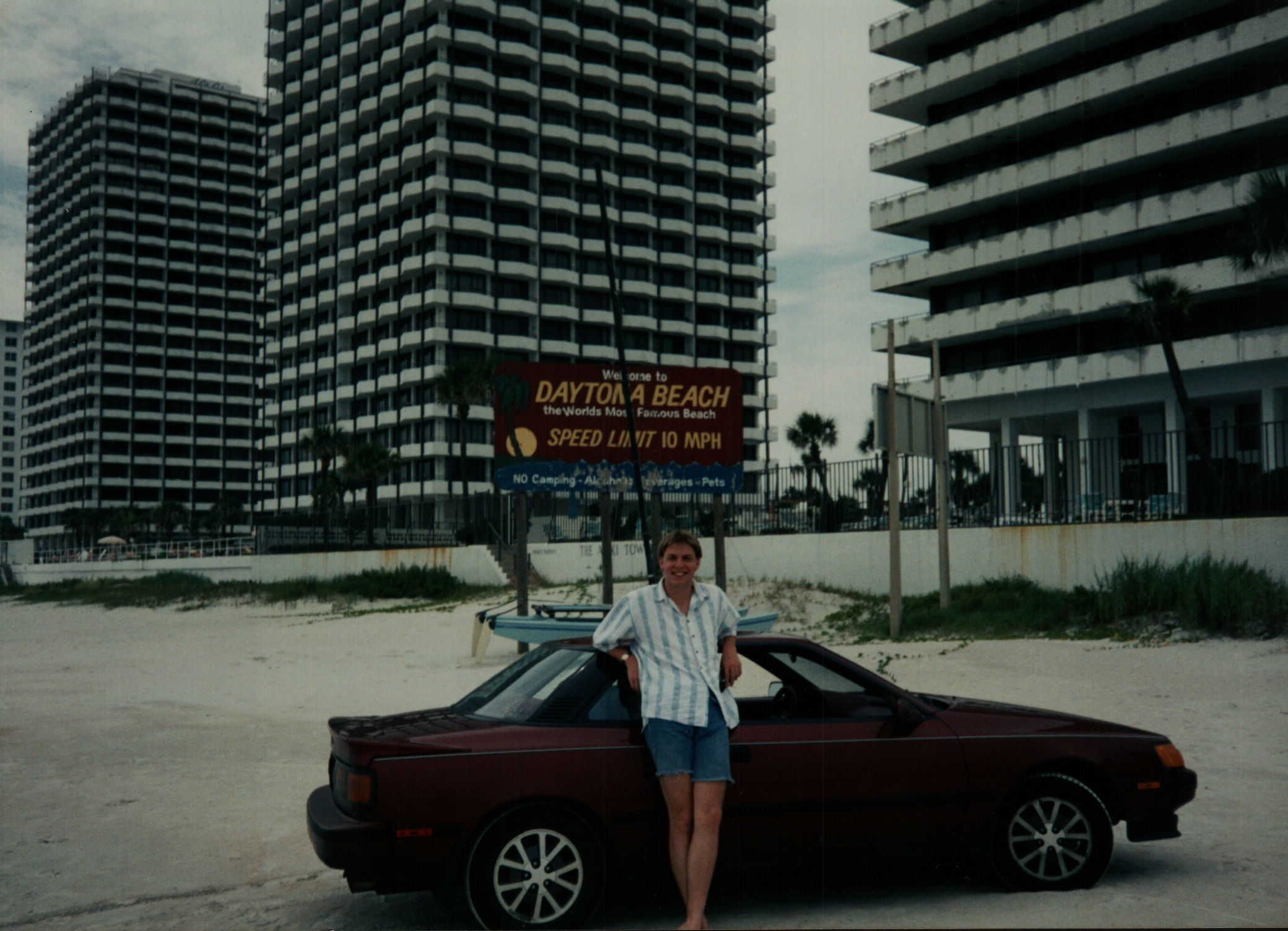 It wasn’t a typically attractive car, but it was kind of sporty, had flip-up headlights, and cruise control! I loved that car and couldn’t have been prouder of it. When, once, I drove it down to Ft. Lauderdale and back, I stopped in Daytona Beach and took it out on the sand. I posed for some wonderfully ridiculous photos with that car. Oy.