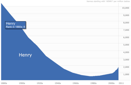 On the other hand, it did fit into that idea of classic but not common. We discovered a handy little website that tracked the popularity of names. Henry peaked in the 1880’s (or before…the 1880’s was as far back as the info goes.) The chart pretty much looked like a ski mountain with modern day being akin to the parking lot below the ski lodge.